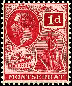 The colours and objects on the coat of arms carry cultural, political, and regional meanings. The woman wearing a green dress is Erin, the national personification of Ireland.[7][8] The Celtic harp she is clutching is another representation of that country.[9] Both these symbols allude to the Irish settlers who immigrated to Montserrat from 1632 onwards.[1][6] The first census conducted in the British Leeward Islands in 1678 found that 70% of the island's white residents claimed Irish ancestry, marking the highest concentration of Irish inhabitants in the federation.[8] The cross recognises the Christian heritage of the island,[6][A] while the woman's embrace of it symbolises the Montserratians' love of Christ.[11]