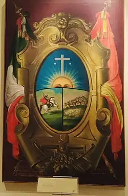 It is divided into three fields where the meanings are shown. The upper one contains a darkened sun crowned by a cross, over the night sky that is revealed by the presence of two stars in the upper corners. This quarter represents the eclipse in which both the apostle and the cross appeared. In the lower left field, there is an image of the apostle, dressed in military clothing and mounted on a white horse. The apostle holds a sword in one hand and a banner of Spanish royalty in the other. In the lower right field, a vine laden with grapes is represented, and five ears of wheat, which represent the fertility of the Querétaro soil.[2]