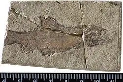 All genera assigned to the family are small fusiform fish with the largest genus, Barbalepis, measuring out to an estimated total length of 250–260 millimetres (9.8–10.2 in).[6] The fish had large pectoral fins along with a single large dorsal fin with the origin of this dorsal fin being located in front of the pelvic fins. Unlike later members of the family, the pelvic fin of "Coccolepis" liassica and Plesiococcolepis hunanensis was supported additionally by a bony plate located along the base of the fin.[7] The fin ray count of the pectoral fins range between 41-49 rays and the dorsal fin has over 30 rays.[1] Similar to other early ray-finned fish, coccolepidids had a deeply forked tail with both lobes being almost equal or equal lengths depending on the taxon.[2] The scales of coccolepids are mostly amioiod in shape with ganoid and rhomboid scales being present on the upper lobe of the caudal fin in some taxa.[8] These scales mostly lack ganion, with the material only being present as a thin layer. The surface of the scales of coccolepids differ between genera with some being smooth while others possess extremely small denticles.[7]