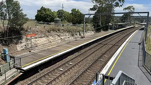 Southbound view of the station platforms from the Lake Road overpass, November 2023
