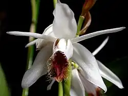 Coelogyne barbata is a species of flowering plant in the family Orchidaceae.[1][2] It is a shade-loving orchid that blooms in the months of October–November. It occurs in the Himalayas, Nepal, India, China and Myanmar. It grows epiphytic on trees or lithophyte on rocks in lower montane forests at an altitude of 1000 to 1800 meters above sea level.[3] It is also found in Phalee (geographical coordinates 25.143524,94.28334) but is rare. It has long, broad leaves and a bulb stem that grows from the roots. It blooms in September- November. It's a shade loving orchid.