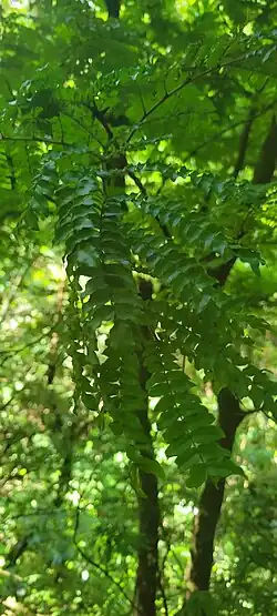 C. costaricensis is a rounded tree growing to 15 m (49 ft) tall. The twigs, petioles, rachises, and peduncles are densely covered in fine brown hairs. The leaves are bipinnate with 4-8 pairs of pinnae, each pinna bearing 7-14 pairs of leaflets. Small nectar glands can be found between the pinnae. The leaflets are oblong-lanceolate with a rounded base and somewhat pointed tip, each measuring 1.5–2.5 cm (0.59–0.98 in) long. The white, brushlike flowers are borne on a 3–6 cm (1.2–2.4 in) peduncle. The fruits are long, red pods growing up to 15 cm (5.9 in) long, twisting as they mature to reveal shiny black seeds.[3][4]