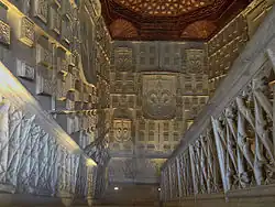 The only staircase that connects both floors is rectangular of two sections, Isabelline base, decorated walls with padding of Renaissance influence with the founder's heraldry; an impressive Mudéjar roof on a frieze with the Catholic Monarchs's initials; and neo-Gothic parapets with same trace that the base, added in works in the 1860s to replace the wooden fence that had.