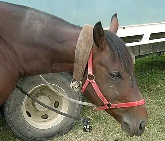 A collar designed to teach horses to tie up and to tie stallions at public events. It is constructed from double-stitched wide leather (sometimes fleece lined), with heavy duty dees sewn into each end. The collar is placed on a horse just behind the poll strap of a headcollar (headstall) which is used in conjunction, and a strong rope passes through the headcollar to secure the two dees so that the horse's wind is not impaired in any way. This manner of application will reduce the likelihood of the collar slipping and injuring or choking the horse. Sometimes used for tethering horses, they are expensive and are potentially dangerous if the horse should become entangled in the tether or frightened, etc.[10]