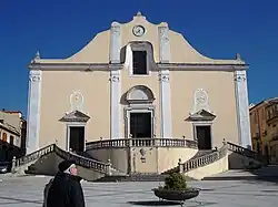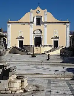 The collegiate church, characterized by the external stone staircase that divides into four branches, with its 2,000 m2 (22,000 sq ft) of surface area, 58.5 m (192 ft) in length, 32.4 m (106 ft) in width and 25 m (82 ft) in height, is the largest church in the diocese of Cerreto Sannita-Telese-Sant'Agata de' Goti.[1] Inside it are preserved numerous 18th-century paintings, valuable wooden statues, some ancient Cerretese ceramic floors, a 19th-century organ in a Baroque case, and some altars made of inlaid polychrome marble.