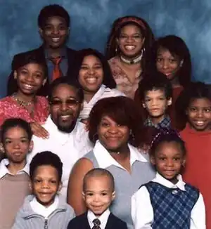 Picture taken at the Come Alive New Testament Church of Medford, New Jersey. Raymond and Vanessa Jackson and the adopted and foster children in their care. Bruce Jackson, aged 19 years and weighing 45 pounds (20 kg), is standing next to Vanessa Jackson; the other three boys being starved are standing together