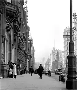 During the 1950s and 1960s, the street became subject to extensive redevelopment and many historic buildings were demolished by Whelan the Wrecker, despite the efforts of the National Trust and the Save Collins Street group.[9] While some examples of Boom Style architecture survive, the grandest examples were lost to the wrecker's ball.[10] Of the major losses, the most significant were the large Victorian buildings including the Federal Coffee Palace, Colonial Mutual Life building, Robb's buildings, Queen Victoria Buildings, City of Melbourne Bank, Scott's Hotel, Melbourne Mansions and APA building.[1] Many of the buildings destroyed in this era were documented by architectural photographer Mark Strizic and can be found in the archives of the State Library of Victoria.