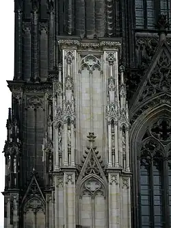 The Cologne Cathedral Seal (German: Kölner Domplombe) was a section of unclad brickwork which covered destroyed masonry on an exterior pillar of Cologne Cathedral. In November 1943, during an air raid by the allies, a bomb seriously damaged a pillar on the northern tower of the cathedral, sparking fears for the structural integrity of the surrounding parts of the building. The missing sandstone was replaced with bricks by the spring of 1944, which remained visible on the north tower for over 60 years. As the last major war damage, the seal was repaired between 1995 and 2005 and faced with cut stone. Some experts had argued that the seal should be left undisguised as an anti-war memorial.[1]
