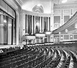 The interior had a three-story auditorium with two balconies. The marble used was rose Tavernell imported from France. The three grand chandeliers lit the long center ramp that swept up to the interior doors. Set in the marble arches of the columns were baskets of flowers, gifts from Wilmer's and Vincent's many clients in the theater world.[1]