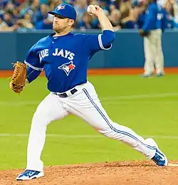 ![]() Colt Hynes pitching on his final MLB appearance game with the Toronto Blue Jays on April 18, 2015 | |