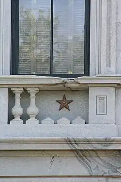 The six impacts from Sherman's cannonballs to the granite exterior of the State House were never repaired, and are today marked by bronze stars.