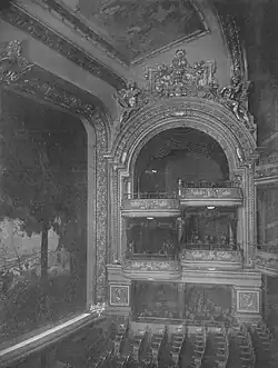 The theater was designed by William H. McElfatrick and had a capacity of 1,385.[1] It occupied the ground floors of the new office building. The decor was a form of Beaux Arts. There was a mural painted by Arthur Thomas above the proscenium arch called "The Goddesses of the Arts." There were two balconies, as was common with theaters designed by McElfatrick. The theater was one of the first to have a ventilation system that partially cleaned the air of tobacco smoke.[2]
