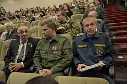 Igor Girkin, a Russian citizen and FSB officer from Moscow[2] who commanded the Donbas People's Militia in Sloviansk, initially denied Russian involvement in the insurgency.[3] He said his unit was formed during the annexation of Crimea by the Russian Federation, and that two-thirds of its members were Ukrainian citizens. Girkin also said that the Sloviansk insurgents had agreed to work with the leadership of the Donetsk People's Republic, despite some conflict between insurgent groups.[4] According to a spokesman for the Donetsk People's Republic, the militants that occupied Sloviansk were "an independent group...supporting the Donetsk protest",[5] while insurgents in Sloviansk and Kramatorsk identified themselves as members of Pavel Gubarev's Donbas People's Militia.[6] The group's forces at Sloviansk included some professional soldiers amongst their ranks, as well as retired veterans, civilians, and volunteers, while those in Donetsk have been confirmed to include former Berkut special police officers.[7] When asked by The Sunday Telegraph where their weapons had come from, one veteran of the Soviet invasion of Afghanistan nodded at the Russian flag flying from the police station and said: "Look at that flag. You know which country that represents".[7] An insurgent commander in Donetsk, Pavel Paramonov, told journalists he was from Tula Oblast in Russia.[8] In Horlivka, police who defected were commanded by a retired Lieutenant Colonel of the Russian Army,[9] later identified as Igor Bezler. Former Soviet military veteran Vyacheslav Ponomarev, who declared himself mayor of Sloviansk, said that he appealed to old military friends to take part in the militia: "When I called on my friends, practically all of whom are ex military, they came to our rescue, not only from Russia but also from Belarus, Kazakhstan and Moldova."[10]