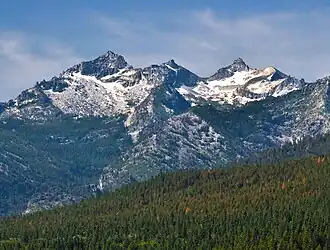 Como Peaks is west of the Continental Divide in the Bitterroot Range which is a subrange of the Rocky Mountains. It is the eighth-highest peak in Ravalli County as well as the eighth-highest point in the Selway–Bitterroot Wilderness which is managed by Bitterroot National Forest.[1] The nearest community is Darby, eight miles (13 km) to the east, and the nearest higher neighbor is El Capitan, 1.86 miles (2.99 km) to the west.[2] The mountain is a set of three peaks: the West Peak is the highest point at 9,624 feet, the Middle Peak is 9,537 feet,[4] and the East Peak is 9,493 feet.[5] Precipitation runoff from the mountain's slopes drains to the Bitterroot River. Topographic relief is significant as the summit rises 4,400 feet (1,341 meters) above Tin Cup Creek in two miles (3.2 km), and 5,400 feet (1,646 meters) above Lake Como in four miles (6.4 km). This mountain's toponym has been officially adopted by the United States Board on Geographic Names.[3] The mountain is named in association with nearby Lake Como which in turn was named by Antonio Ravalli in the 1840s for Lake Como in his native country of Italy.[6] Ravalli County is named after him. The mountain is also unofficially called the Three Sisters.[7]