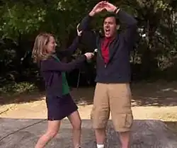The official website for The Office included three cut scenes from "Company Picnic" within a week of its original release. The first clip, one minute and fifty seconds long, is an extended sequence of company picnic scenes, including Michael talking about how excited he is to see Holly, Stanley convincing Creed to stand in his sunlight to provide shade, and Dwight and Andy mocking the Utica team by calling them "You-sucks-ti-ca!"[14] The clip also featured a brief appearance of Meredith's son Jake, played by Spencer Daniels, who has not appeared in the show since the second season episode, "Take Your Daughter to Work Day"; after he rudely and pointedly addresses her by her first name, Meredith orders him to spend the picnic locked in their car.[13] In the second one-minute long deleted scene clip, Andy yells at his volleyball teammates when they make a mistake, a Buffalo branch player snaps at his own team, and Charles makes fun of Jim from the sidelines.[15] In the third 30-second clip, Dwight bullies and pesters everyone about the final point of the volleyball game against corporate, prompting Meredith to throw the game by throwing the ball at Dwight during her serve.[16] Within a week of the original broadcast of "Company Picnic", the official NBC store website made the red Scranton branch T-shirts and black New York City corporate T-shirts worn by characters in the episode available for sale.[17][18]