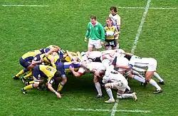 Line of scrimmage in American football (left) and scrum in rugby union (right)