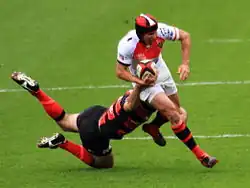 Tackle in American football (left) and rugby union