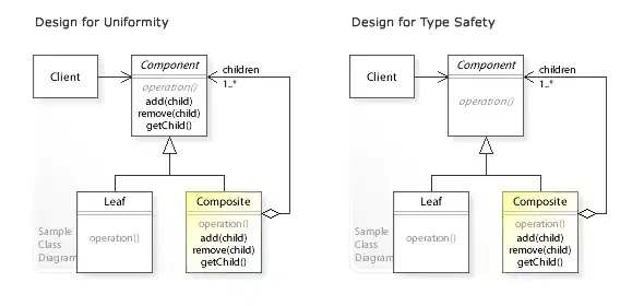 Componentinterface. This enables clients to treatLeafandCompositeobjects uniformly. But type safety is lost because clients can perform child-related operations onLeafobjects. - Design for type safety: Child-related operations are defined only in the