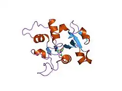 Ovotransferrin (conalbumin) is a glycoprotein of egg white albumen.[1] Egg white albumen is composed of multiple proteins, of which ovotransferrin is the most heat reliable. It has a molecular weight of 76,000 daltons and contains about 700 amino acids. Ovotransferrin makes up approximately 13% of egg albumen (in contrast to ovalbumin, which comprises 54%).[2] As a member of the transferrin and metalloproteinase family, ovotransferrin has been found to possess antibacterial and antioxidant and immunomodulatory properties, arising primarily through its iron (Fe3+) binding capacity by locking away a key biochemical component necessary for micro-organismal survival. Bacteria starved of iron are rendered incapable of moving, making ovotransferrin a potent bacteriostatic.