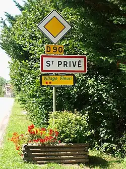 Road sign in Saint-Privé, Yonne (2 flowers)