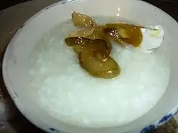 In Taiwan, congee is known as moê () in Taiwanese Hokkien or xīfàn (稀飯) in Mandarin. Sweet potato, taro root, or century egg is often added for taste. A famous congee dish in Taiwan is milkfish congee.[25]
