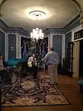 The first parlor, also known as the "blue room" or "Music room" features blue wallpaper inside of decorative wall moldings and is the scene of most seasonal celebrations. During the Christmas season the largest tree is placed in the bay window of this room. It houses the grand piano and Victrola, among other instruments.