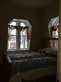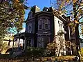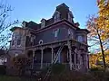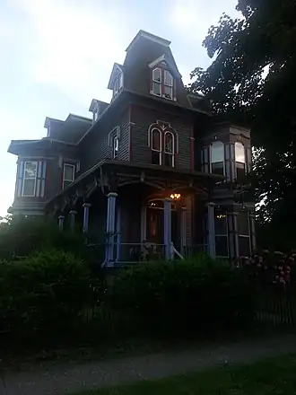 The interior features elaborate and extensive woodwork, quarter-sawn oak floors throughout the house, one of the longest cantilevered staircases on the East Coast of the United States, a large and ornate antique Eastlake-style chandelier in the dining room, and the only known existing installation of M.H. Birge & Sons block-printed peacock wallpaper ca. 1915. The home was constructed by the owners of Conklin Wagon Works, one of Olean's most important industries in the late 19th century. It was subsequently owned by the Mountain family, who operated the Mountain Clinic Infirmary, and is currently an owner-occupied single family residence not open to the public. On the morning of October 8, 2023 the house caught fire, resulting in the residents being displaced and a total loss of the historic interiors.[2]