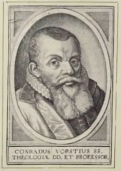 Conrad Vorstius (German: Konrad von der Vorst; Latin: Conradus Vorstius; 19 July 1569 – 29 September 1622) was a German-Dutch controversial Remonstrant theologian, successor to Jacobus Arminius in the theology chair at Leiden University, and—as a theologian—second to Johannes Uytenbogaert in the Remonstrant Society.[1][2] His appointment, and the controversy surrounding it, became an international matter in the political and religious affairs of the United Provinces during the Twelve Years' Truce, supplying a pretext for the irregular intervention of King James I of England in those affairs.[3][4] Vorstius published theological views which were taken by some to show sympathy with the Socinians, and was declared unworthy of his office by the Calvinists at the Synod of Dort in 1619.[5][6][7]