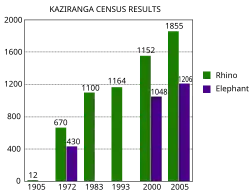 For controlling poaching many steps have been taken by the park authorities including maintenance of existing and construction of new poaching camps, adequate staffing, providing mobility, patrolling, intelligence gathering, firearms and control over the use of firearms around the park.[4] The park has about 122 anti-poaching camps[5] scattered throughout the Park, including two floating camps on the Brahmaputra river. There are 123 country boats, 6 mechanized boats, 4 speed boats (OBM), 2 motor launches, 20 motor vehicles and 47 departmental elephants to assist the anti-poaching squad.[5] There are some 800 personnel, which include about 200 forest guards, game watchers, home guards, forest protection force, and temporary staff who guard the park round the clock.[5] The foresters are provided with 346 numbers of .315 bore rifles, 33 SBBL, 18 DBBL, five revolvers, 20 fixed and mobile wireless stations and more than a hundred walkie-talkies which helps in the anti-poaching activities and in fighting against the poachers.[5] With effective protection methods the number of poaching cases has declined in the park over the past few years.[6]