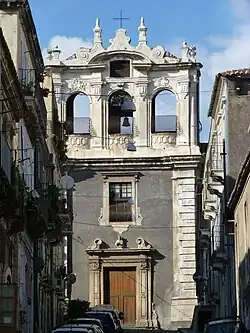 A conservatory of this name was documented by 1586, with the aims of providing for young and poor abandoned girls, patronized by the aristocrat Giovanni La Rocca.[1] The institution not only housed the girls, who were entering marriagable age, but also taught them a craft and prepared them for marriage with a small dowry.[2] After the 1693 Sicily Earthquake flattened the prior structure, which was located near the present church of San Biagio in Piazza Stesicoro, the present buildings were erected circa 1720 under the patronage of the aristocrat Giuseppe Asmundo Mendicino, work continued by his heirs. The Asmundo family[3] remained as directors into the 20th century. The church of Sant'Agata del Conservatorio delle Verginelle has a narrow, three-story facade on via Greco, with the top story having a three-arch veranda from which the girls could watch processions pass by.