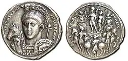 In 310 a panegyric, preserved in the Panegyrici Latini collection and delivered at Trier for the joint occasion of the city's birthday and Constantine's quinquennalia, recounted a vision apparently seen by the emperor while journeying between Marseille and Trier.[17] The panegyricist recounts that the god Apollo appeared to Constantine in company with Victoria and together presented him with three wreaths representing thirty years of power.[17] This vision was perhaps in a dream experienced by the emperor while practising incubation at the shrine of Apollo Grannus in Grand, Vosges.[17] Eusebius was aware of this vision, or reports of it, and refers in his own Panegyric of Constantine of 336 to "tricennial crowns"[18] bestowed by the hand of God in Christianity on Constantine, "augmenting the sway of his kingdom by long years".[19][17]