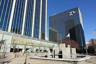 Constitution Plaza is a large commercial mixed-use development in Downtown Hartford, Connecticut. It is located on the east side of the downtown area, near the Connecticut's Old State House. The plaza consists of two main plazas, which are connected by an elevated bridge. The northern plaza is reminiscent of an Italian piazza, with a 40-foot-tall granite clock tower and patterned brick paving. The southern plaza is dominated by a central fountain.