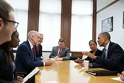 The Treaty of Versailles in 1919 recalled that "peace can only be established if it is based upon social justice",[28] and the UN Charter, "based on the principle of the sovereign equality of all its Members", said that "to save succeeding generations from the scourge of war, which twice in our lifetime has brought untold sorrow to mankind", the UN would "reaffirm faith in fundamental human rights", and members should "live together in peace with one another as good neighbours". The Bretton Woods Agreements Act 1945, United Nations Act 1946 and International Organisations Act 1968 wrote the UK's funding and membership of the United Nations, the International Monetary Fund, the World Bank, and other bodies, into law.[29] For example, the UK bound itself to implement by order UN Security Council resolutions, up to the actual use of force, in return for representation in the General Assembly and Security Council.[30]