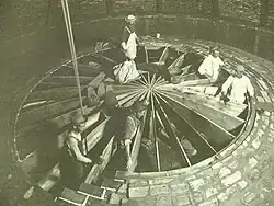 Since construction began on the Minnesota Capitol in 1896, hundreds of workers helped complete the statehouse in 1907. While names of the Capitol Commissioners, and architect Cass Gilbert and his associates were cast on a bronze plate, the building's craftsmanship was done by workers who have largely been forgotten. This mainly-immigrant workforce used hand tools with skills generally not practiced by 21st-century construction workers.[15] A labor strike in January 1902 interrupted work on the Capitol. Stonemasons struck for ten weeks to protest the presence of a non-union blacksmith.[16]: 5  The commission said soliciting and then rejecting all bids from contractors may create for itself a reputation that would lead to fewer applicants. For this reason, the commission signed several contracts that were somewhat higher than estimated, including those for metal-furring and lathing, plastering, and ornamental ironwork.[16]: 5–6