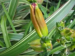 Buds of a Hemerocallis cultivar with a short globular bud (lower left) distorted by infestation of the hemerocallis gall midge, compared with normal cylindrical bud at centre