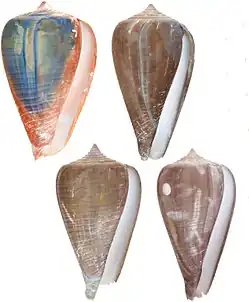 | Four views of a shell of Conus recognitus; all images are reversed images of specimens photographed under UV light | |