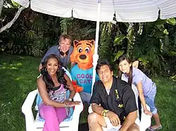 The cast of Cool Cat Saves the Kids. From left to right: Vivica A. Fox, Derek Savage, Jason Johnson (in costume), Erik Estrada and Jessica Salazar.