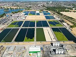 The Coppermills Water Treatment Works is a large water treatment works in the Lea Valley in east London. Completed in 1969 by the Metropolitan Water Board,[1] it is now owned and operated by Thames Water. In 2009, Coppermills was connected to the Thames Water Ring Main via the Northern Extension Tunnel, enabling the facility to be a major supplier of water to the whole London area.[2] It is capable of supplying a maximum of 680 million litres (150,000,000 imp gal; 180,000,000 US gal) of water per day.[3]