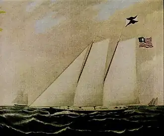 The Boston two-masted, keel schooner rigged yacht Coquette was built in 1845 by an early Swedish yacht designer and shipbuilder Louis Winde, for yachtsmen James A. Perkins; also known as "Jim" Perkins. She was launched ion March 27, 1846 from the Winde, Clinkard & Co. shipyard in Chelsea, Massachusetts.[1] The Coquette was an example of an early American yacht with a clipper bow. Her unique design was later used by George Steers, best known for the famous racing yacht America. The Coquette was named for a 420-ton boat built in 1844 at East Boston by Samuel Hall for the Perkins family.[2] Her dimensions were 66 ft. in length on deck; 19 ft. breadth of beam; 7 ft. depth of hold; and 80-tons burthen.[3]