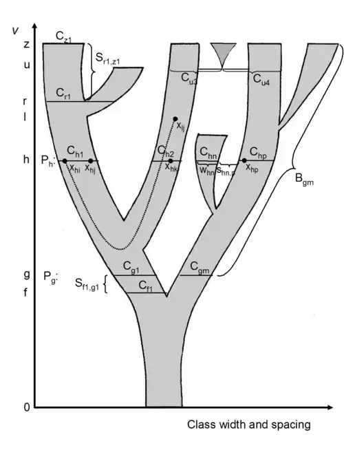 The picture to the right explains the different parts of a coral. Vertical axis is time, horizontal axis may be richness, morphological diversity, some other population measure or even scaled arbitrarily. Each point x in the diagram corresponds to an individual, a population or a taxon. At point of time h, there is an equivalence partition of points into classes C. A class Cg1 is the ancestor of the entire branch above it, Cr1 is the closest common ancestor class of two segments. A segment S is defined by two classes such that there is no branching between them. On top in the middle is visualized a horizontal event, such as hybridization between members of different classes, leading to a new segment and thus to a fan coral.[7][8]