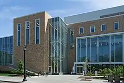 The Agriculture Quadrangle (Ag Quad) contains buildings which house many of the programs in the College of Agriculture and Life Sciences. It is a quadrangle east of the Arts Quad and west of the College of Veterinary Medicine. The oldest building still standing on the quad is Caldwell Hall, in the Colonial Revival style, which opened in 1913.[30] The Plant Science Building opened in 1931 and Warren Hall, across from Plant Science, opened in the next year, The art deco style Mann Library on the eastern end of the quad, connecting Warren Hall on the north to the Plant Sciences Building on the south, opened in 1952.[31] Between Plant Science and Tower Road is the greenhouses built in 1931 to house Liberty Hide Bailey's palm collection and the Minns Garden.[32] Designed by Gwathmey & Siegel and completed in 1990, Keith Kennedy and the "new" Roberts Halls, featuring an archway that connects the two halls, extend along the western face of the quad,[33] having replaced the original Roberts Hall (1906) and East Roberts Hall and Stone Hall. The Computing and Communications Center (formerly named Comstock Hall),[34] which was designed by Cornell faculty members Clarence Martin, Jean Hebrard, and George Young,[35] stands between Roberts and Caldwell Halls. The quad now opens toward the south with the Minns Garden between Roberts and Plant Science.