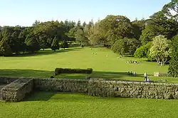 However the trustees were personally liable for any expenditure that could not be met by the trust's funds and so in 1914 residential sites along Wheturangi Road were sold on long term lease to meet immediate needs for cash and the trustees asked that local bodies give consideration to some form of rate relief complaining that over 60 per cent of the trusts revenue went in taxes.[10] St Cuthbert's College took 8 acres by the formal entrance on a 99-year building lease in 1919.[11] After many years of petitions and representations from Auckland to Parliament in 1922 Parliament decided that the Cornwall Park land should be valued for rating purposes at its "restricted value", this valuation of the park having regard to its income as grazing land. By this time the capital value of the Park's land exceeded £200,000.[12]