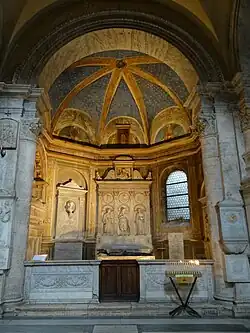 The marble and bronze sepulchral monument of Cardinal Pietro Foscari was originally placed in the middle of the Foscari Chapel, which was demolished for the building of the Cerasi Chapel in 1600. It was made by a Sienese sculptor, Giovanni di Stefano in the 1480s but previously thought to have been created by Vecchietta.