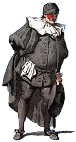 Il Capitano did not have a consistent dress code, but he did have a consistent costume theme. He wore the current soldiers' outfit from a foreign country. Sometimes his clothes were slashed to show that he had been in battle. His hat was overdone and typically had large feathers sticking out of it. Ribbons and shiny buttons often cluttered his clothes. He always carried a sword, and in the 17th century the sword upgraded to a gun. Every il Capitano costume also included a coat or cloak, that he could fling off in a moment of rage or passion.[1][2]
