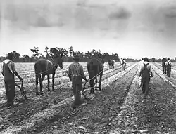 A record 1931 cotton crop of over 15.5 million bales, over two million higher than projected, resulted in a plunge in prices of agricultural commodities.[1] At its lowest since 1905, the price of cotton was less than the cost of production.[2][3] In a telegram to the governors of fourteen cotton-producing states, the Federal Farm Board (FFB) chairman recommended that farmers be forced to plow over every third row of cotton, destroying some 4 million bales of the 1931 crop.[4] The advice was widely criticized.[5]