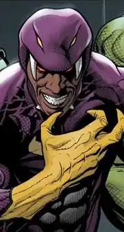 Originally from Mobile, Alabama, Cottonmouth was chosen by Sidewinder to join a snake-themed villain group, the Serpent Society.[1] With the ability to extend his jaws over a foot wide, he was given steel fangs, possibly by the Roxxon Oil Company, which he uses to torture his victims in an almost cannibalistic way. His jaw muscles are superhumanly strong, and can bite with sufficient force to crush cinderblock or metals that are softer than iron. However, very little is known about his past, other than the fact that he was an active criminal in the southern portion of the United States.