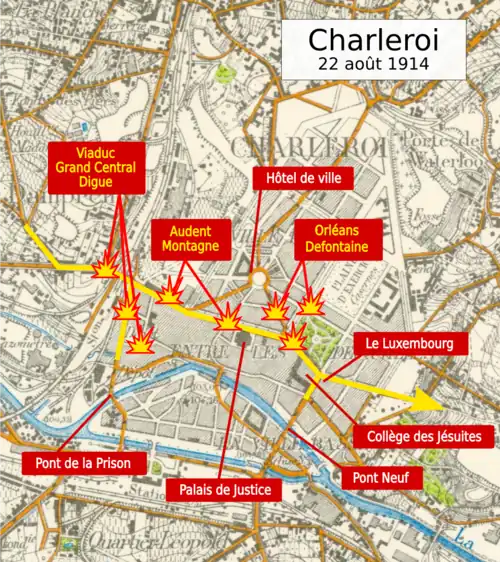 In Charleroi, 41 civilians were killed and 159 buildings destroyed.[21] In Lodelinsart, 93 houses were burnt down and 16 civilians killed, in Dampremy 11 civilians were killed and 134 houses were burnt down, in Montignies-sur-Sambre 37 civilians were killed, in Jumet, 86 houses were destroyed and 10 civilians were killed, in Monceau-sur-Sambre, 251 houses destroyed and 37 civilians killed, as for Couillet, 69 houses were destroyed and 16 civilians killed.[33][34] In all, 250 civilians were killed and 1,300 houses burned in the Charleroi region, not to mention the buildings looted and hundreds of hostages insulted and verbally abused.[35]