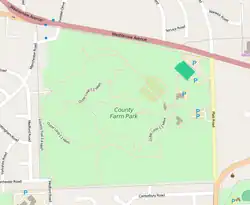 Nelson Meade County Farm Park is a 141-acre public park in eastern Ann Arbor, Michigan owned by Washtenaw County and operated by the county's Parks and Recreation Commission.[1] Consisting of a mix of woodlands, fields, and gardens, the park is home to a wide variety of flora and fauna and is a popular local destination for gardening, hiking, jogging, and biking.[1][2][3] The park has been county land since 1836, although for the majority of the nineteenth and twentieth centuries it was used as the county's poorhouse (complete with a working farm) and then as its infirmary.[2] In 1972, the site began transitioning to parkland with the creation of community gardens, and over the next couple decades various trails and a perennial garden were created.[1][2] Since 2000, the park has experienced significant ecological restoration efforts, including the removal of invasive plants, prairie restoration, and the creation of a wet meadow during the restoration of Malletts Creek.[4][5][6]
