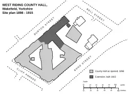The site chosen for the new County Hall was that of Rishworth House on Bond Street, a gentleman's house of 1812 bought by the West Riding Quarter Sessions in 1878. The County Council had received Rishworth House at its creation and used it for committee rooms, offices and a residence for the Deputy Clerk.[5]