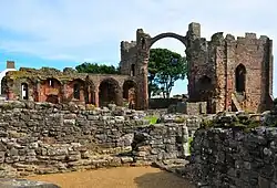 Lindisfarne Priory, in Islandshire. The island was the site of the diocese's original cathedral and was the original burial place of St Cuthbert. The present ruins are the remains of the monastery re-founded here in 1083 by Bishop St-Calais as a subordinate monastery to Durham.[26]